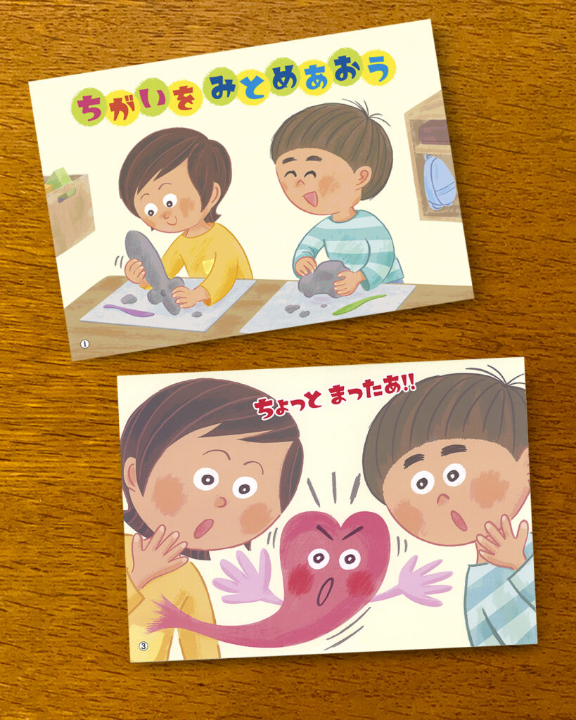 あんぜんあんしん 園生活かみしばい(フレーベル館)Posted on 2025年11月15日By ハラアツシ 包括的性教育をテーマにしたフレーベル館の紙芝居です。3巻セットのうち第1巻『ちがいをみとめあおう』を担当させていただきました。人それぞれの考え方や見た目、家族の形の違いを通して、自分と他者の個性を尊重することの大切さを子どもたちにもわかりやすく、親しみやすく表現しています。 Filed under: 2025年Tagged with: 人物, 子供, 家族, 紙芝居, 絵本